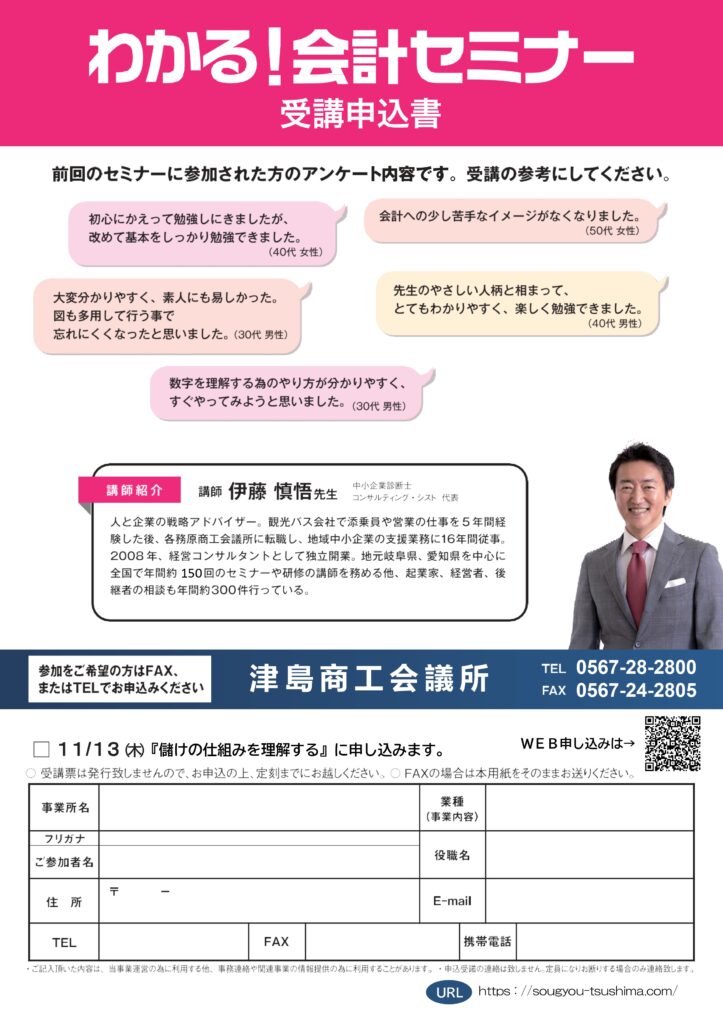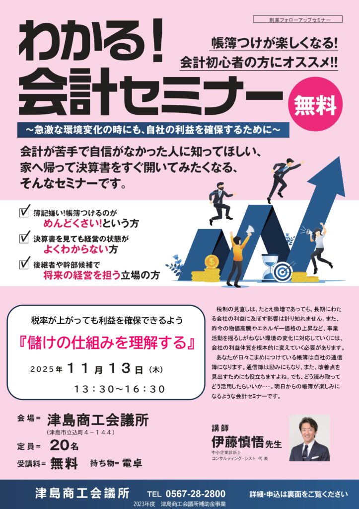 創業フォローアップ 「創業フォローアップセミナー」では、事業を継続する為のアイデアを分かりやすくお伝えします! 創業フォローアップチラシ 配布されている最新のチラシです。 日時・開催場所 開催日時 11月13日(木)13:30~16:30 内容 わかる!会計セミナー 講師 コンサルティングシスト 代表 伊藤 慎悟氏 場所 津島商工会議所 参加費 無料 定員 20名 ※先着順 お問い合わせ・お申込み 必須お名前 必須年齢 必須住所 必須電話番号 必須メールアドレス 任意備考欄 FacebookXBlueskyHatenaCopy