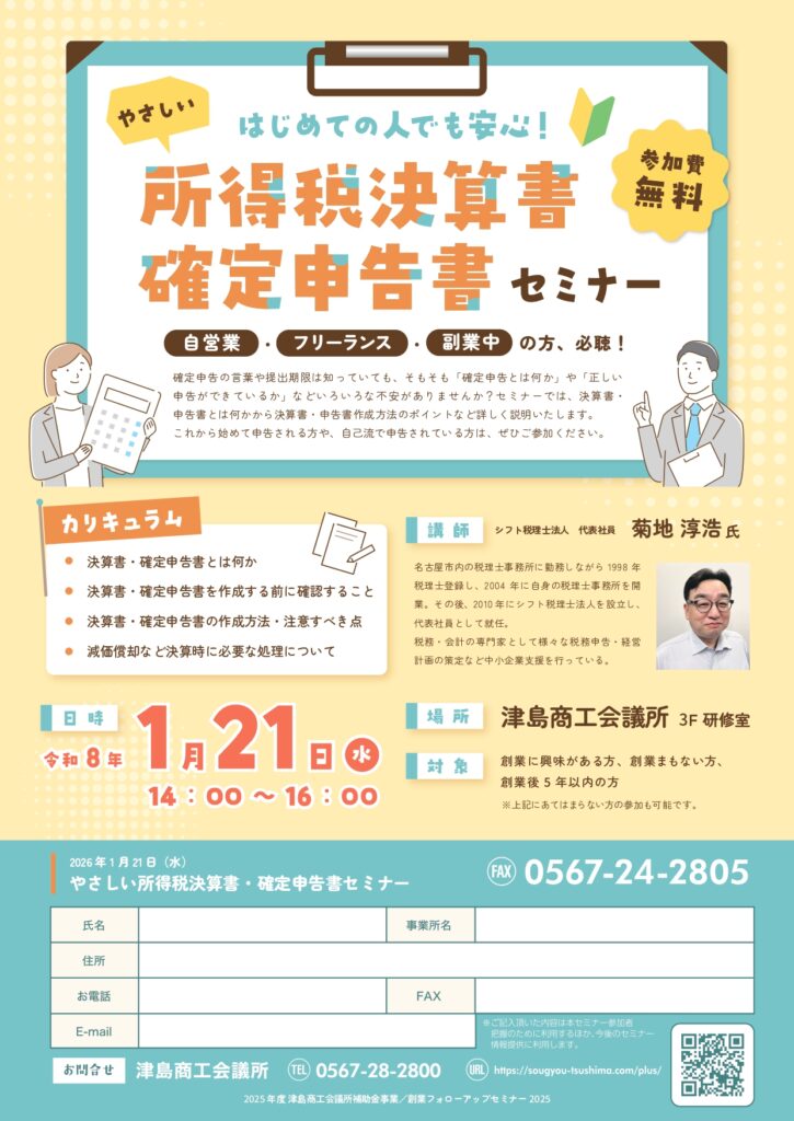 創業フォローアップ 「創業フォローアップセミナー」では、事業を継続する為のアイデアを分かりやすくお伝えします! 創業フォローアップチラシ 配布されている最新のチラシです。 日時・開催場所 開催日時 1月21日(水)14:00~16:00 内容 初めての人でも安心!所得税決算書・確定申告書セミナー 講師 シフト税理士法人 代表社員 菊地 淳浩氏 場所 津島商工会議所 参加費 無料 定員 20名 ※先着順 お問い合わせ・お申込み 必須お名前 必須年齢 必須住所 必須電話番号 必須メールアドレス 任意備考欄 FacebookXBlueskyHatenaCopy